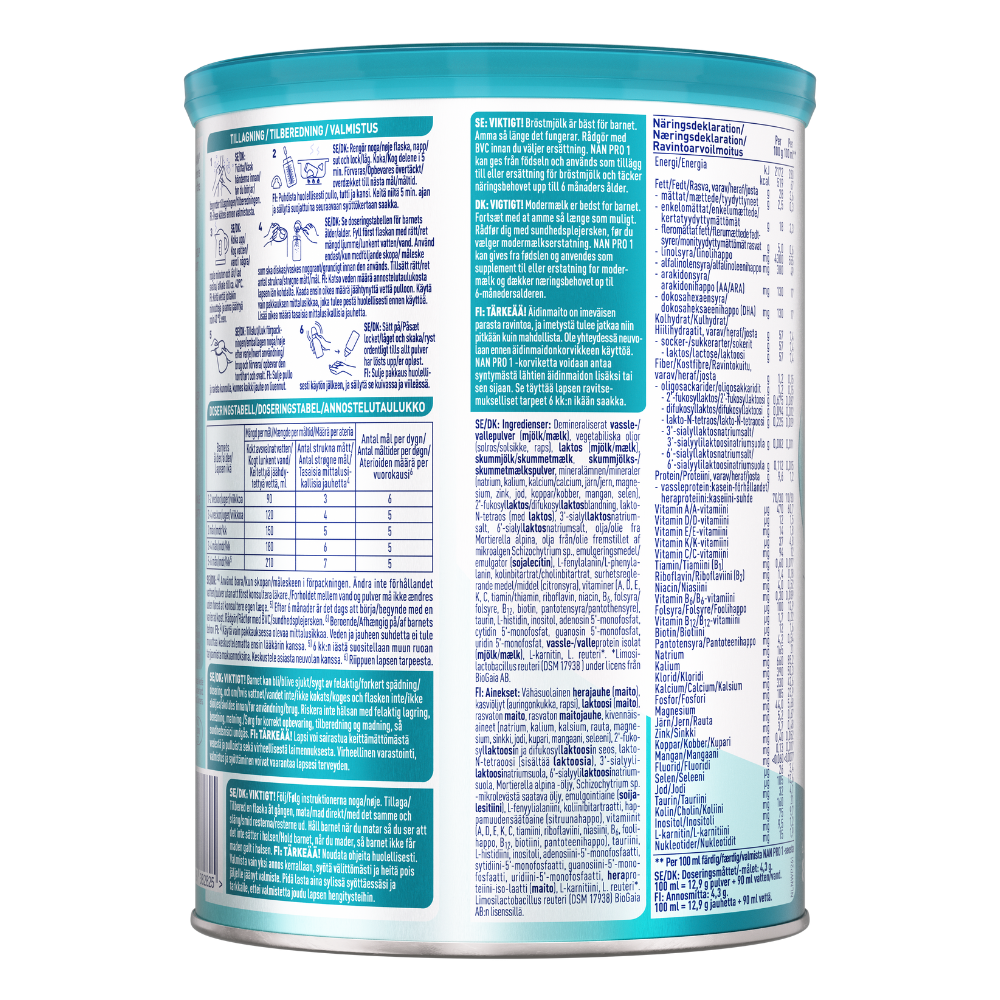 NAN PRO 1 finns också som drickfärdig 200 ml. NAN PRO 2 drickfärdig innehåller inte bakteriekultur L. Reuteri.